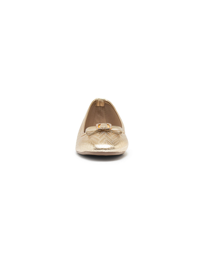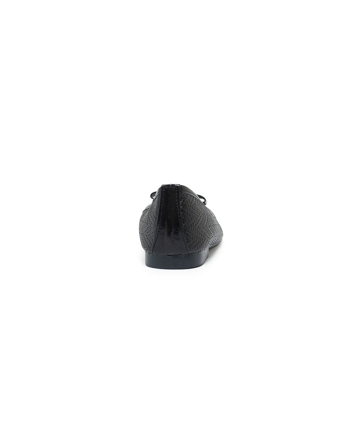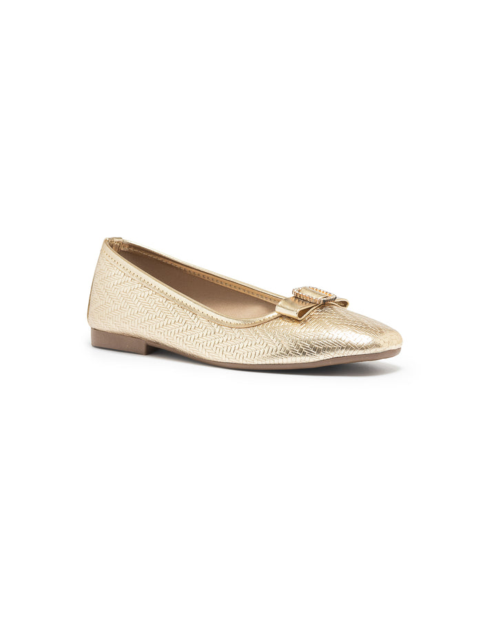 Baleta con textura en relieve de diseño entrelazado, decorada con un lazo fino y una hebilla adornada con pedrería brillante que aporta un toque elegante y femenino; su silueta clásica y suela plana ofrecen comodidad y versatilidad.