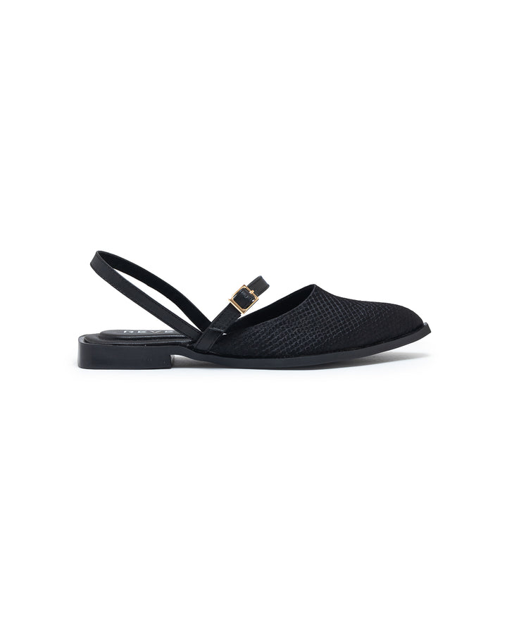 Baleta con acabado texturizado, diseñada con punta cerrada y correa delgada ajustable con hebilla dorada que aporta un detalle elegante y funcional; su suela baja y ligera garantiza comodidad, siendo una opción versátil y moderna para combinar con atuendos casuales o semi-formales en cualquier ocasión.
