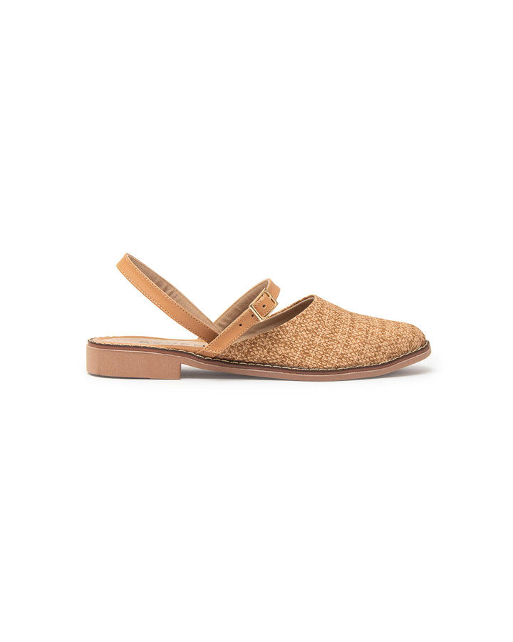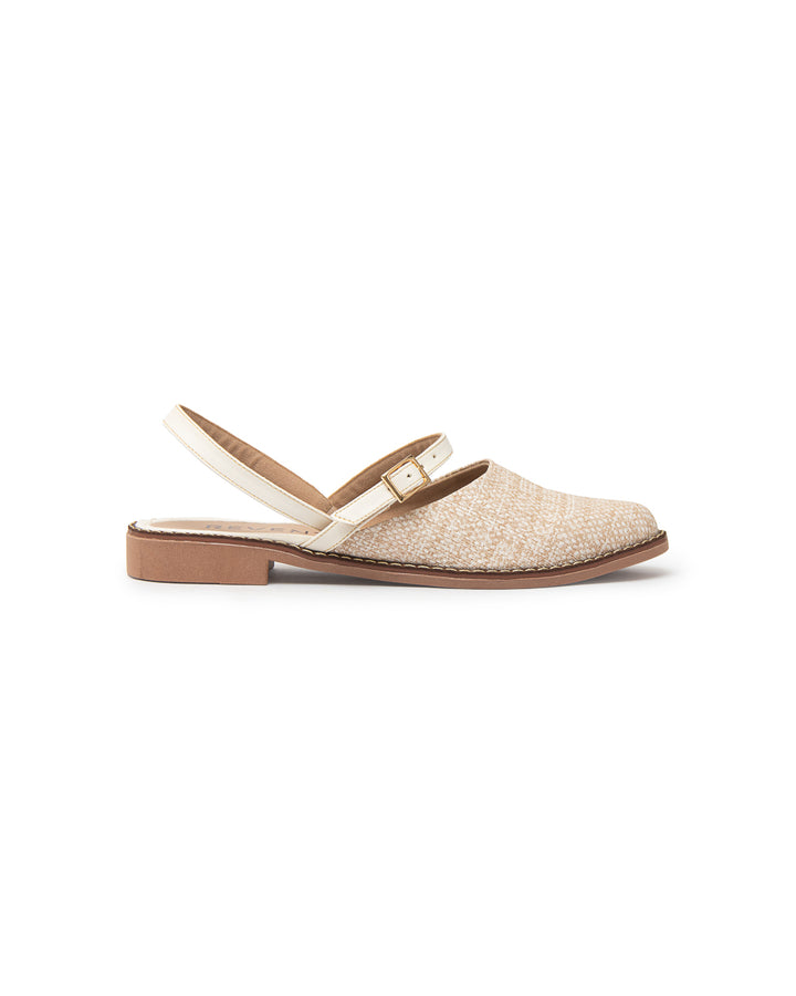 Baleta de dama, diseñada con una punta cerrada en material textil que aporta un estilo fresco y natural. Incorpora una correa ajustable con hebilla metálica dorada, que brinda sujeción y un detalle elegante.