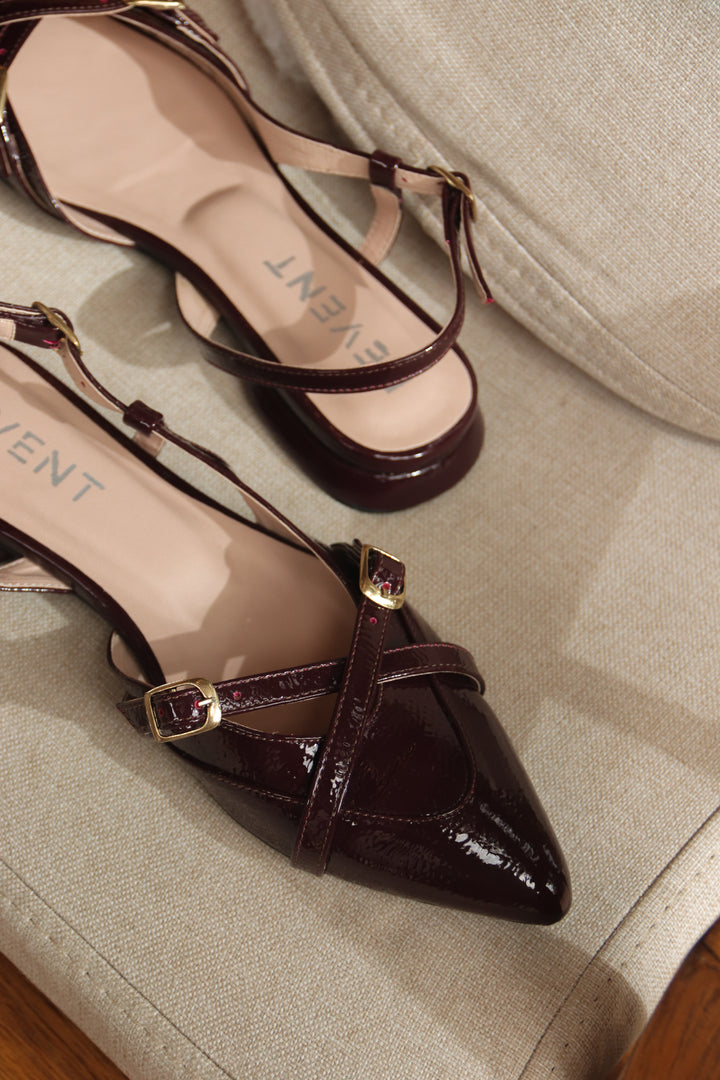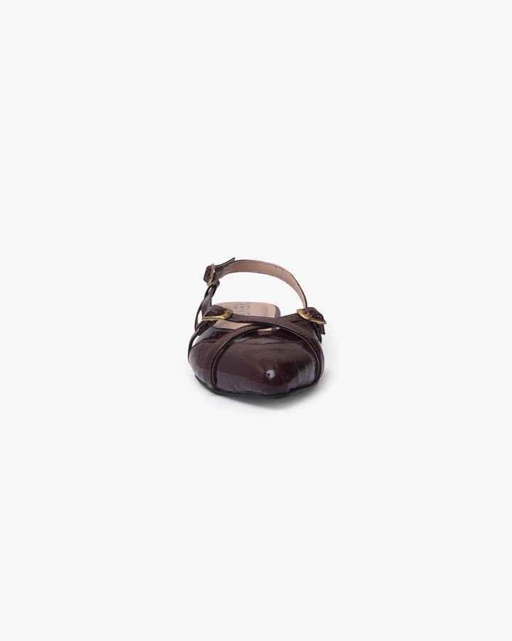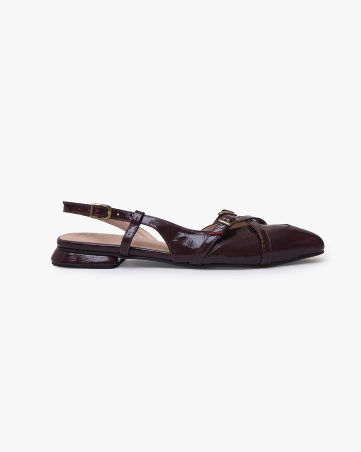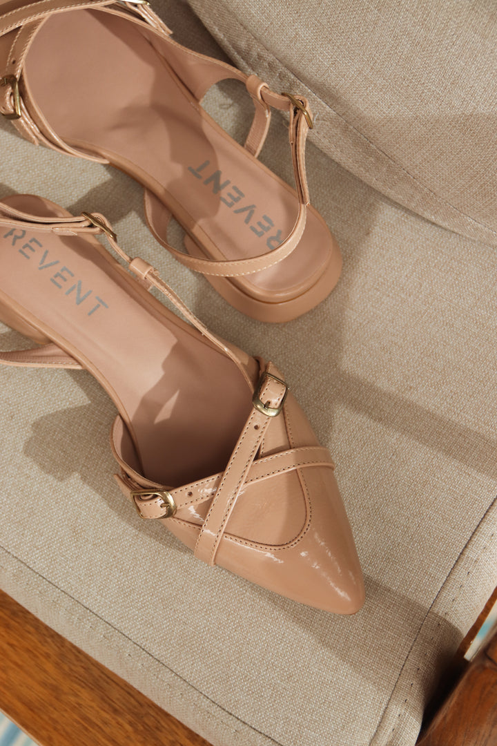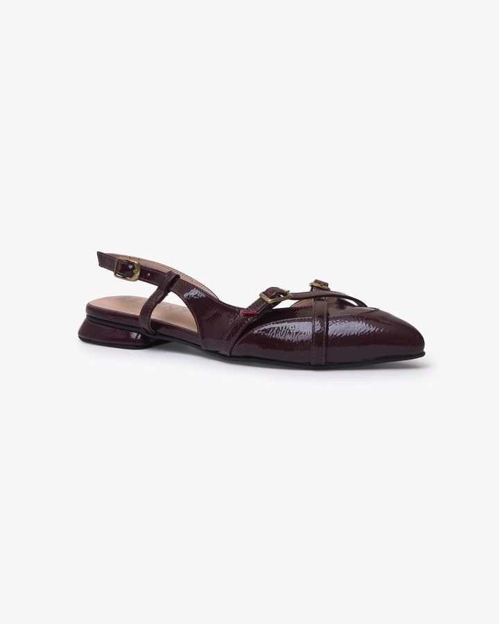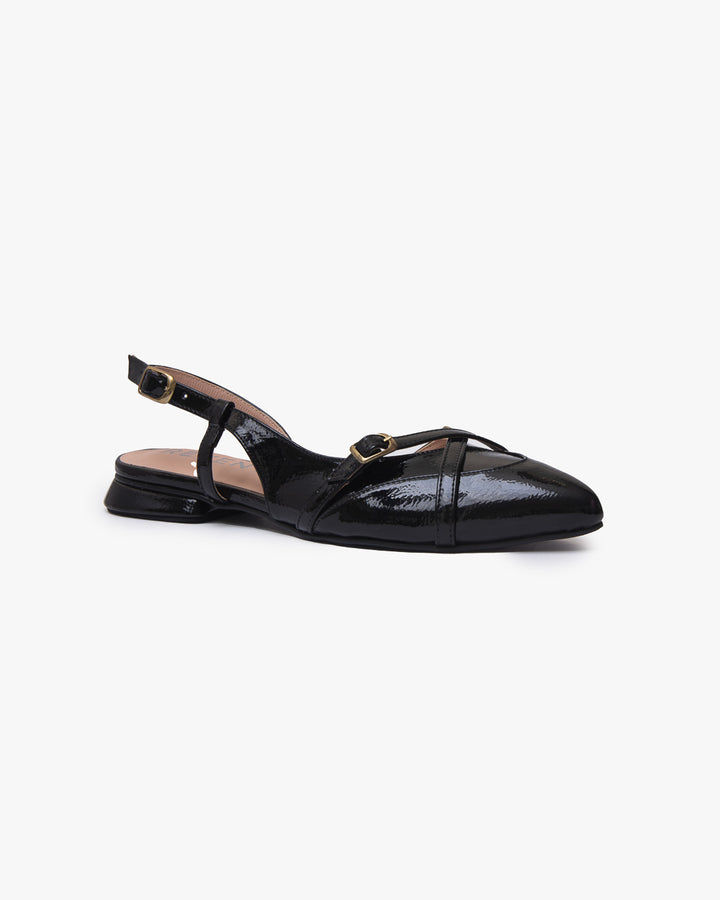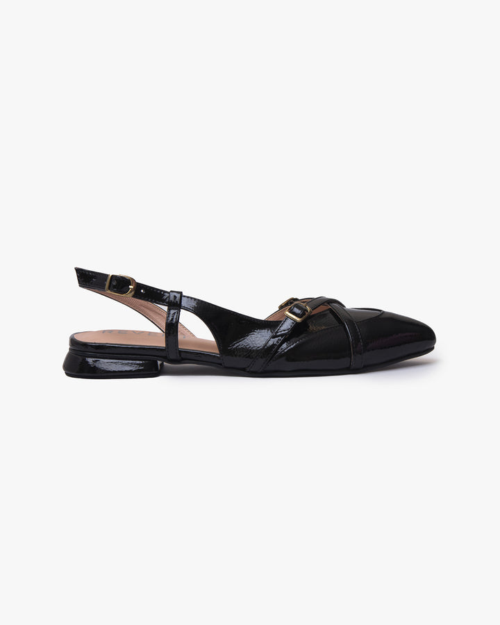 Baleta tipo slingback combina elegancia y comodidad con su diseño de punta cerrada, tiras cruzadas con hebillas decorativas y tacón bajo cuadrado. Ideal para oficina o salidas semi formales.