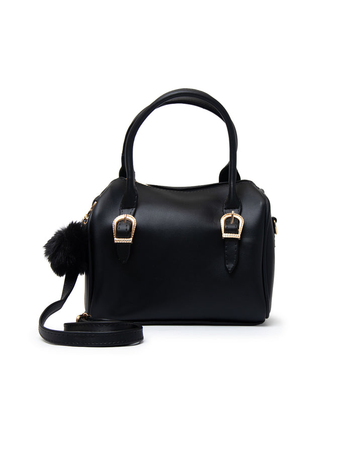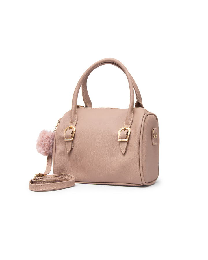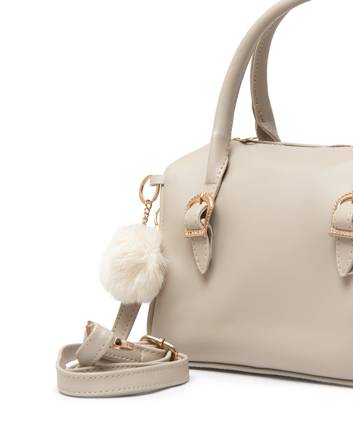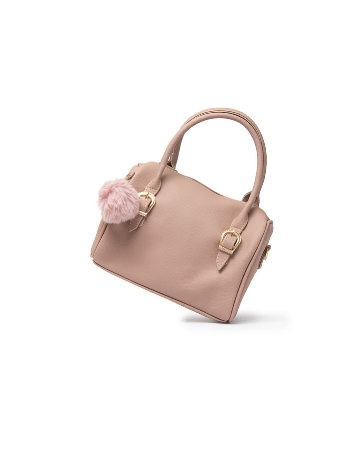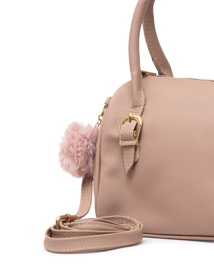 Bolso con asas de mano y correa larga ajustable. cuenta con detalles metálicos dorados y un pompón decorativo. Es práctico, elegante y fácil de combinar.
