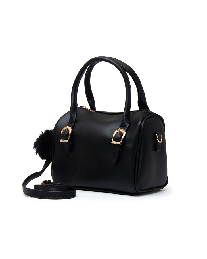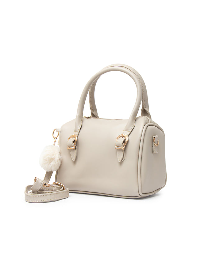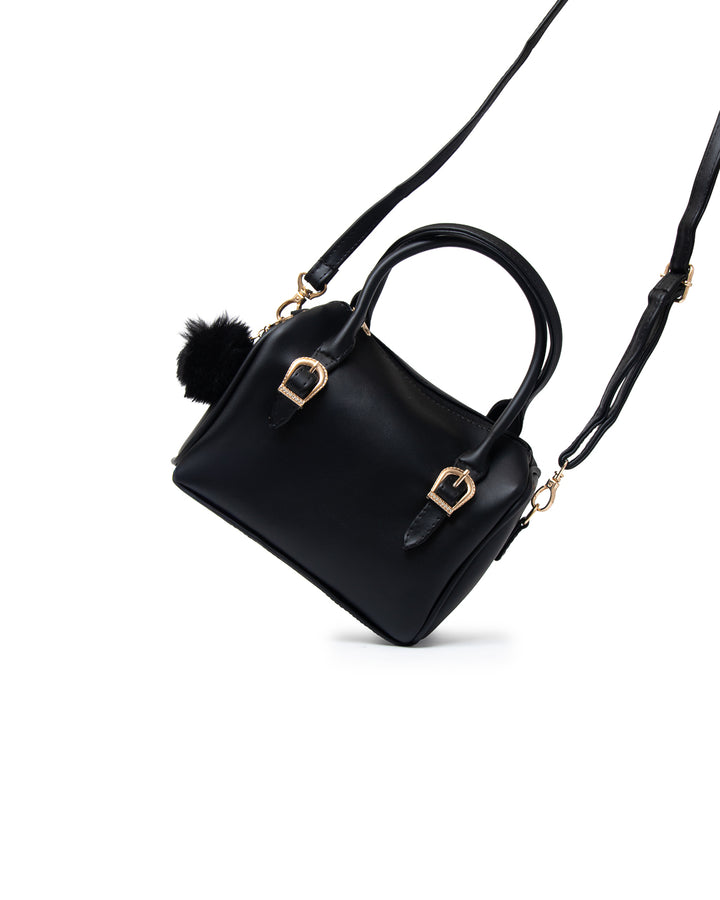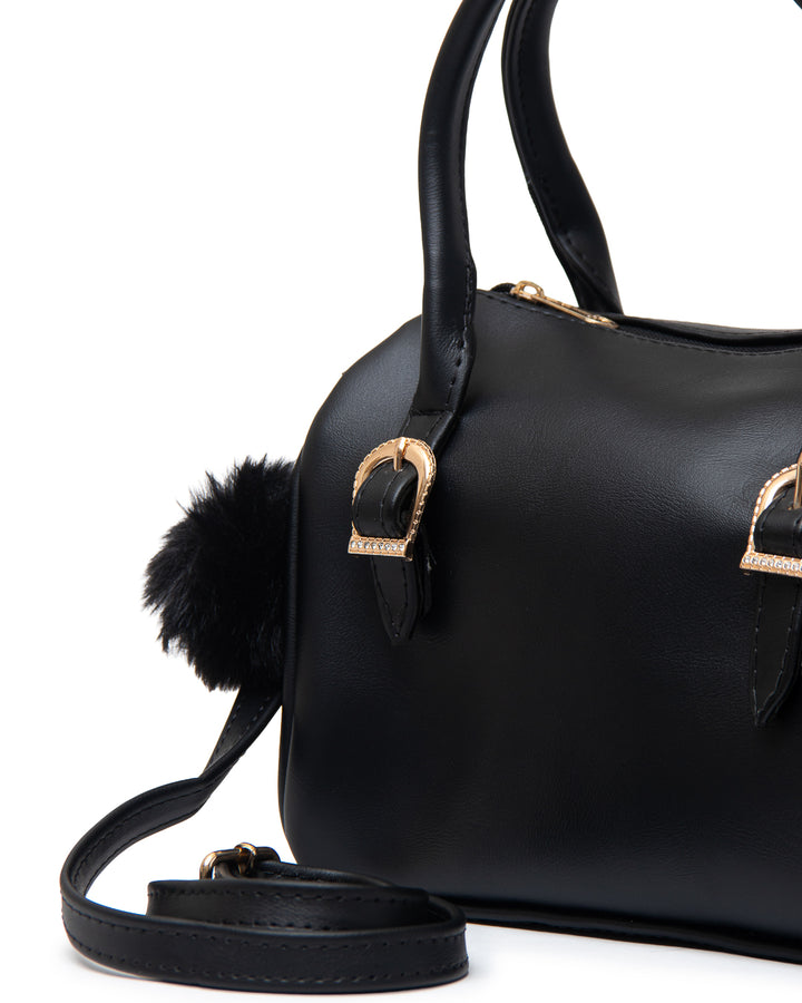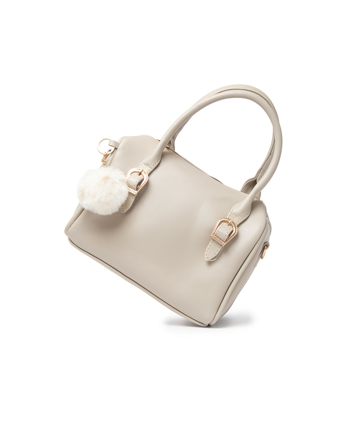 Bolso con asas de mano y correa larga ajustable. cuenta con detalles metálicos dorados y un pompón decorativo. Es práctico, elegante y fácil de combinar.