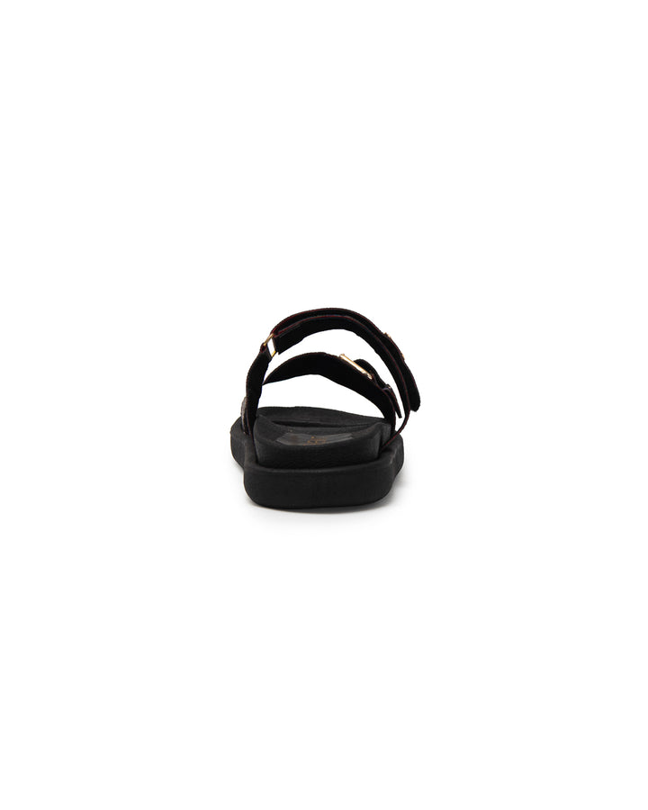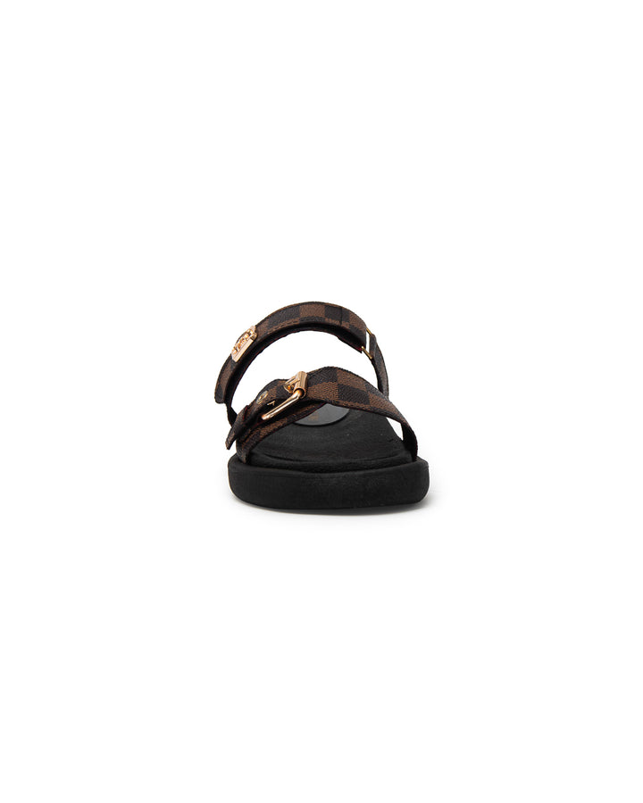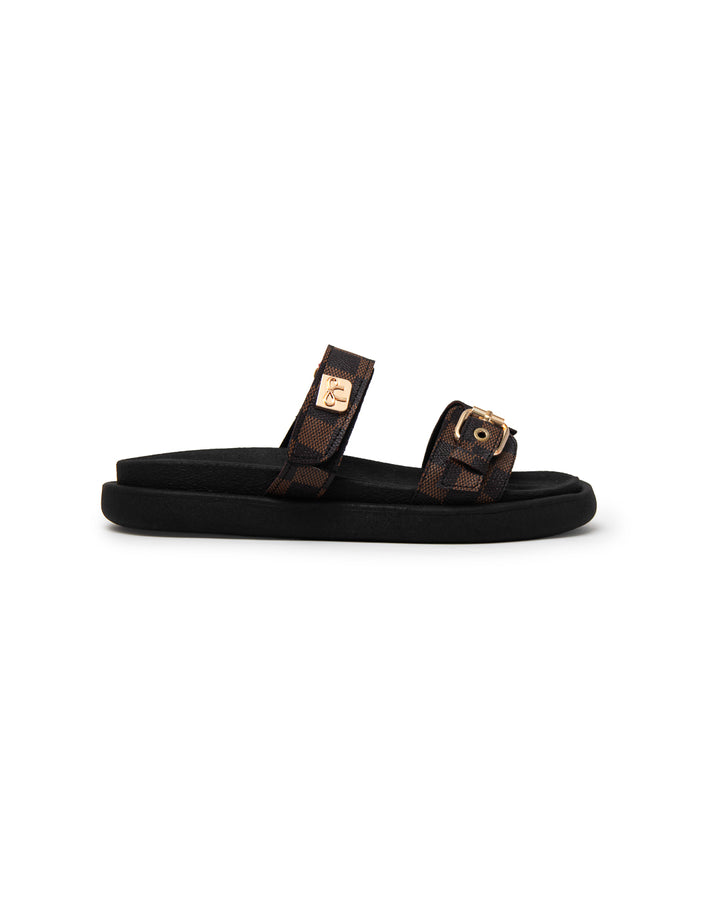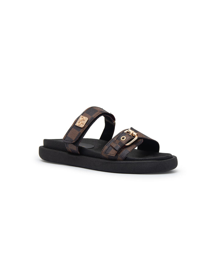 Sandalia plana de estilo casual y moderno, con doble tira ancha, decorada con herrajes metálicos dorados, incluyendo una hebilla funcional. La suela es gruesa y acolchonada, brindando comodidad y soporte para el uso diario.