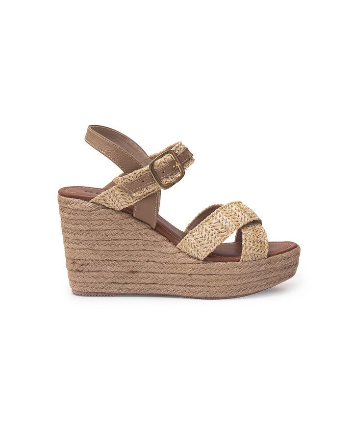 Sandalia de plataforma tipo cuña forrada en yute trenzado, con diseño de tiras cruzadas en la parte frontal elaboradas en textil tipo rafia beige. Cuenta con talonera y correa ajustable al tobillo en material sintético tipo cuero, con hebilla metálica dorada. Un calzado con estilo natural y fresco, perfecto para complementar tus outfits casuales o de verano.