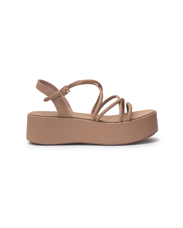 Sandalia de plataforma, con tiras delgadas en material sintético tipo cuero que se cruzan sobre el empeine, brindando un diseño moderno y estilizado. Cuenta con una hebilla metálica dorada y una suela robusta de acabado texturizado que aporta estabilidad al caminar. Ideal para quienes buscan un calzado cómodo pero con estilo, perfecto para looks casuales o salidas informales