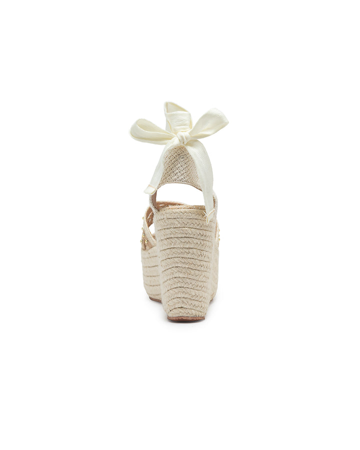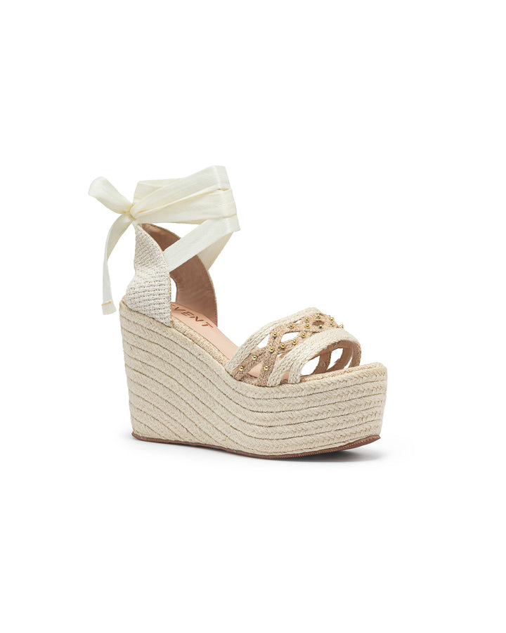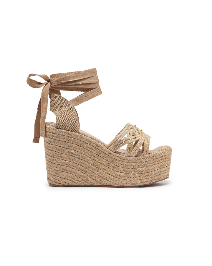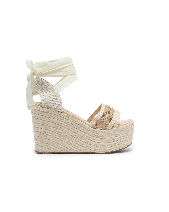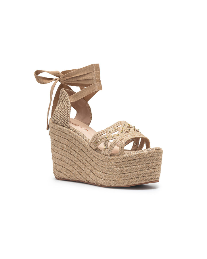 Plataforma tipo cuña forrada en yute natural con diseño de tiras múltiples decoradas con apliques dorados que aportan un estilo moderno y llamativo; cuenta con amarre al tobillo mediante cintas anchas que brindan sujeción y un toque femenino, ideal para looks veraniegos y frescos, perfectos para combinar con vestidos y conjuntos de temporada