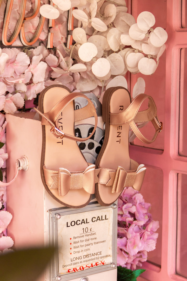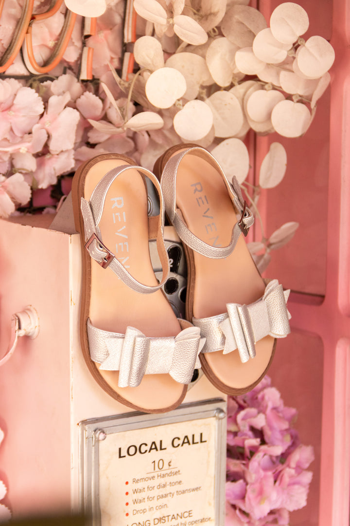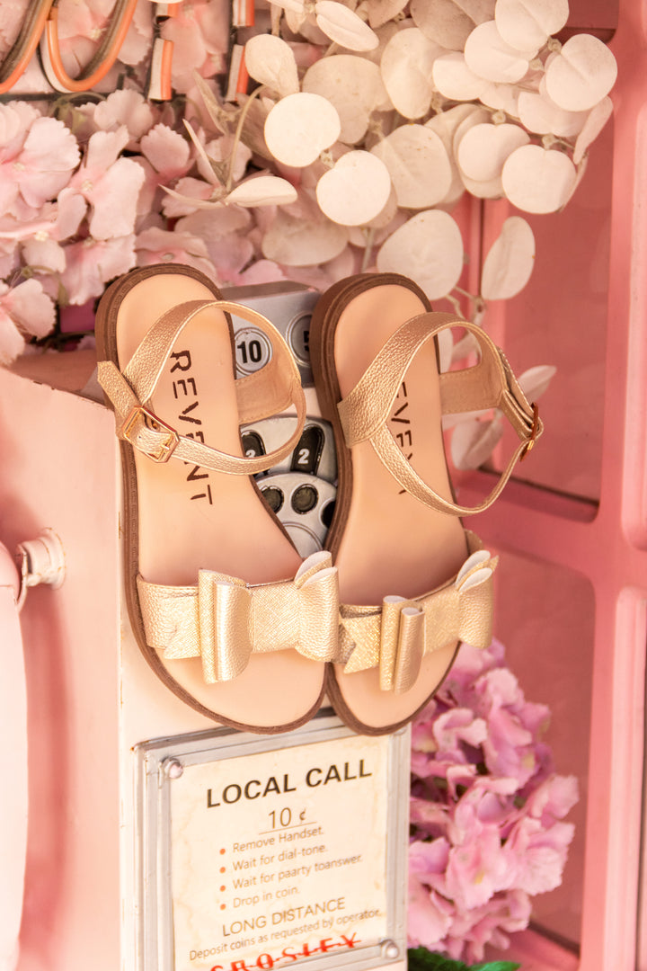 Sandalia plana de niña que incluye un delicado moño doble sobre la capellada. Elaborada en material sintético tipo cuero, con acabado texturizado y correa ajustable con hebilla al tobillo para una mayor seguridad y confort. Ideal para combinar con vestidos o faldas.