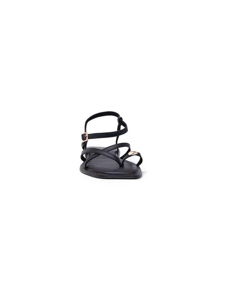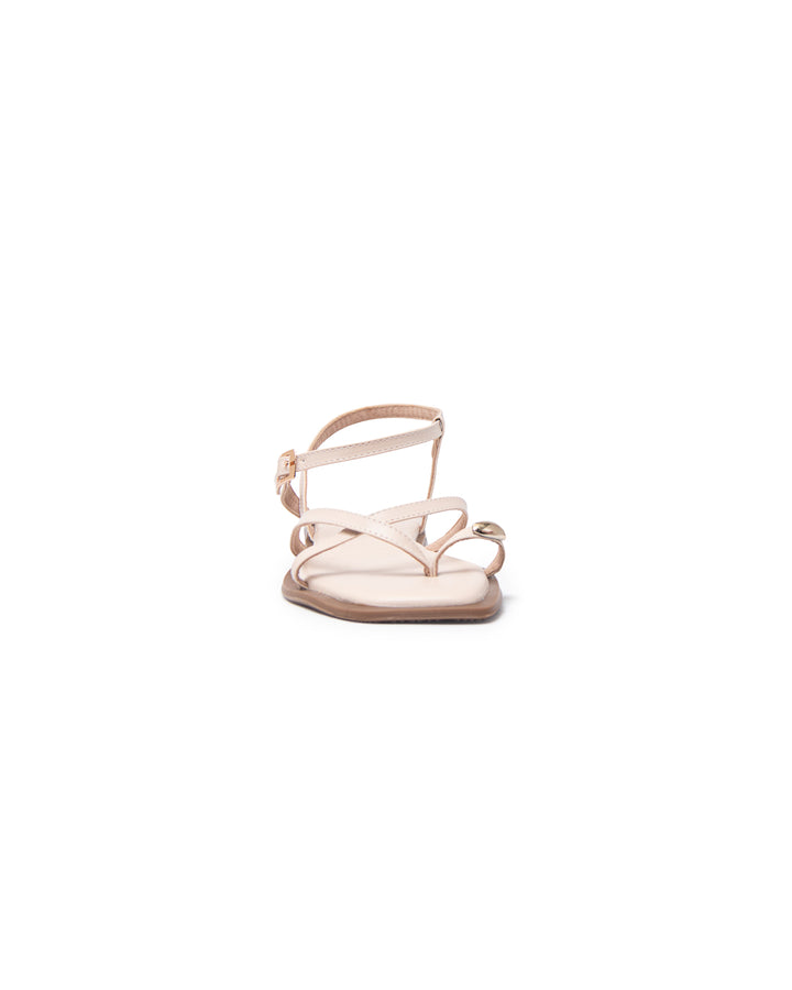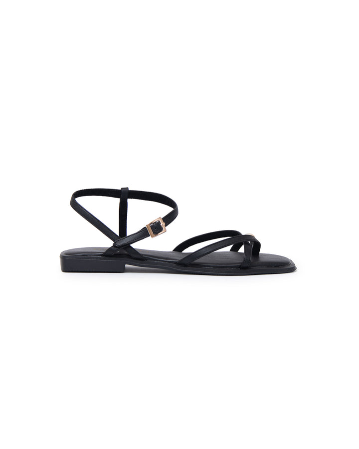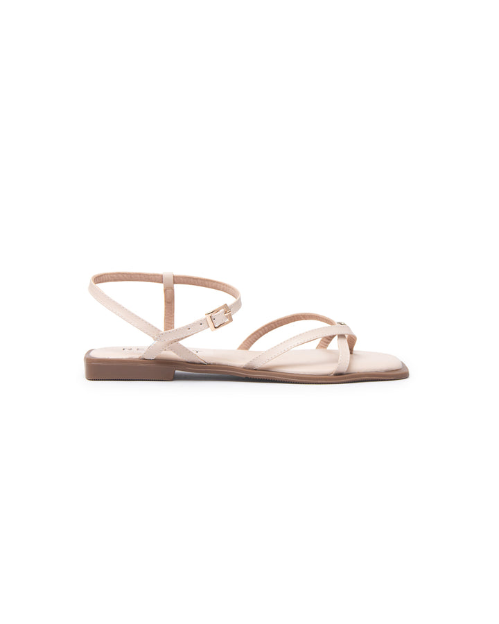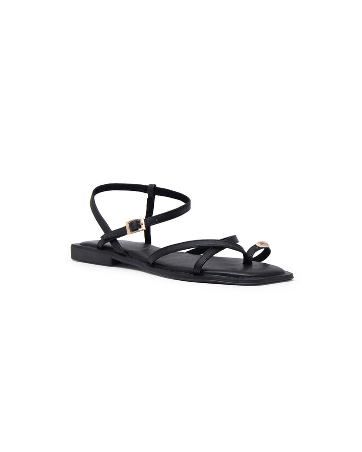 Sandalia plana de estilo minimalista, con delicadas tiras cruzadas y detalle de anillo en el dedo. Cuenta con una hebilla ajustable al tobillo para mayor sujeción y una suela delgada de diseño cuadrado, ideal para un look casual y elegante.