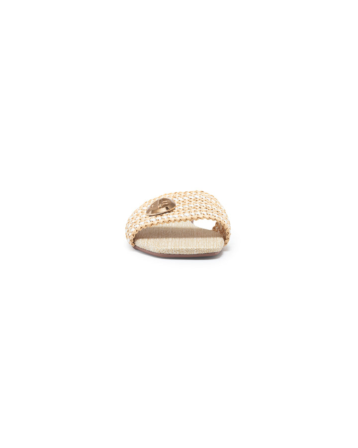 Sandalia plana estilo slide con diseño de tira ancha tejida en tono natural, adornada con un detalle metálico dorado que aporta un toque elegante y moderno; ligera y cómoda, es la opción perfecta para complementar looks frescos y casuales de temporada.
