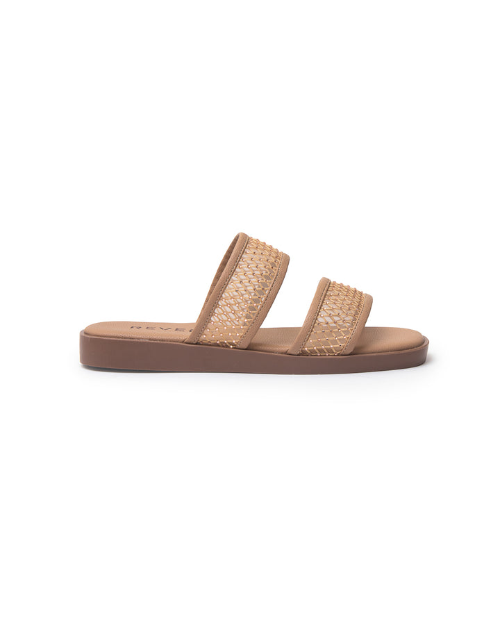 Sandalia plana que ofrece comodidad y estilo en cada paso. Con dos tiras anchas tejidas en tono camel, combinan un diseño moderno con un toque artesanal. Su suela plana y acolchada brinda confort durante todo el día, ideal para usar en días cálidos o en salidas casuales.