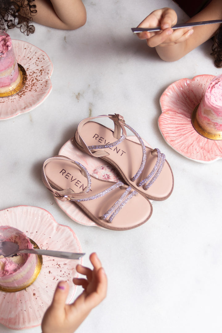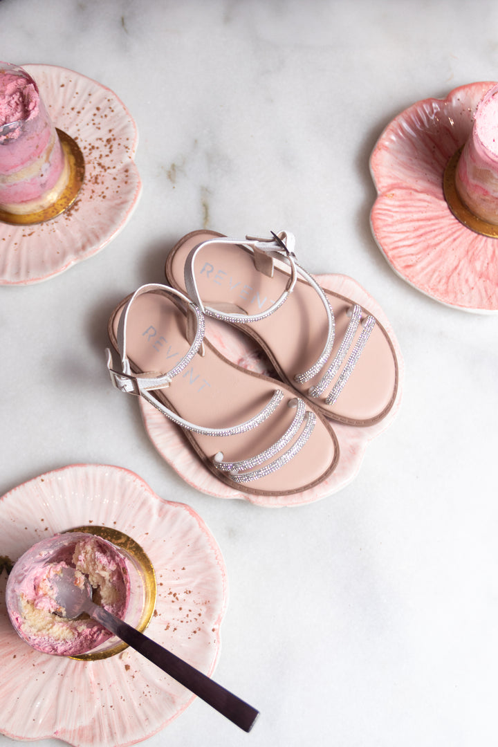 Sandalia de niña destaca por sus tiras delgadas decoradas con brillos sutiles que aportan un acabado femenino y sofisticado. Elaborada en material sintético blanco con correa ajustable al tobillo y hebilla metálica para un ajuste seguro.