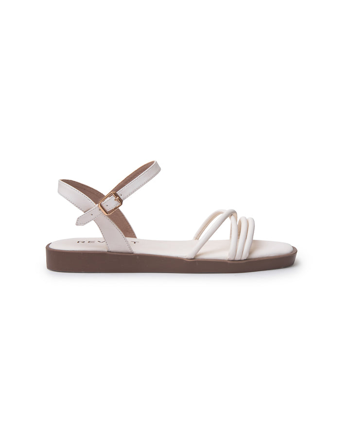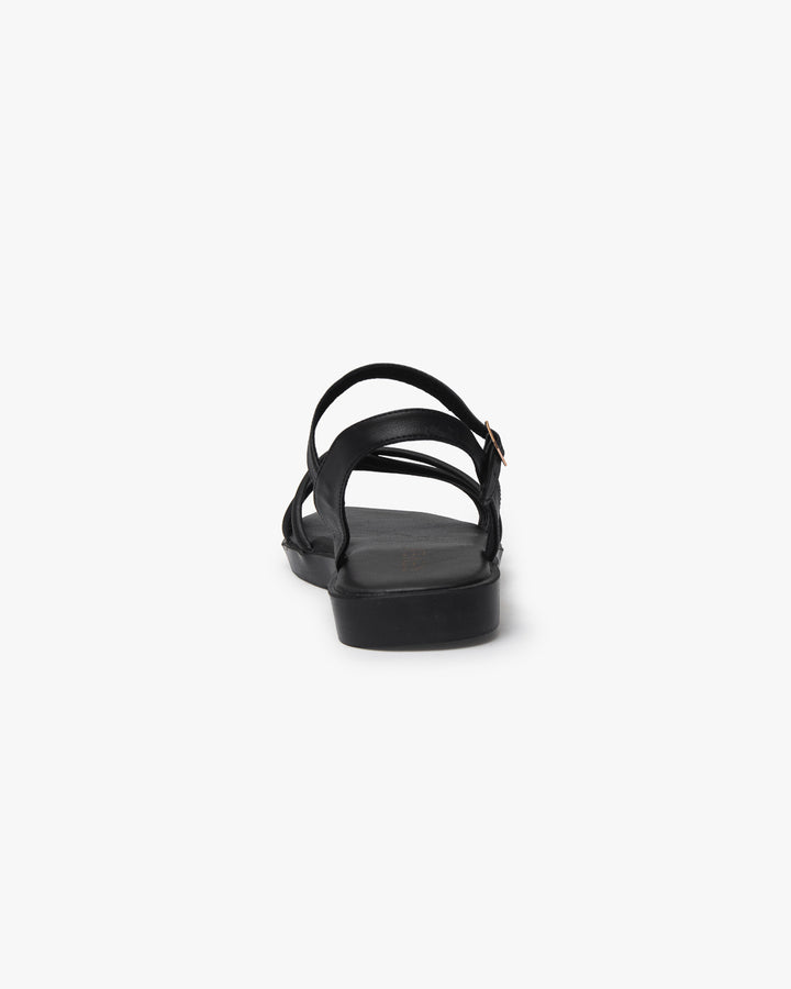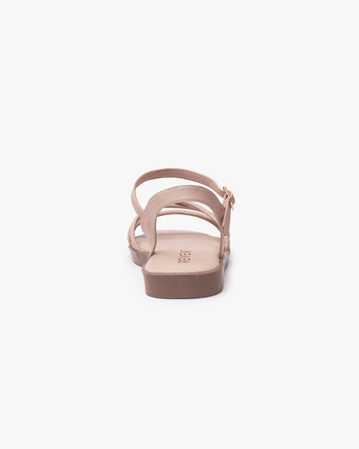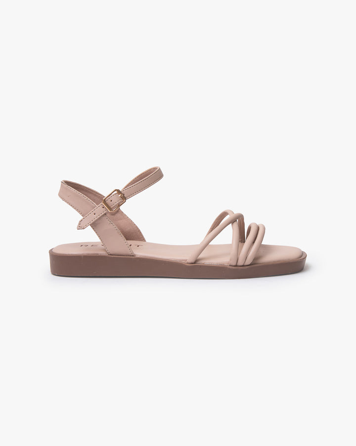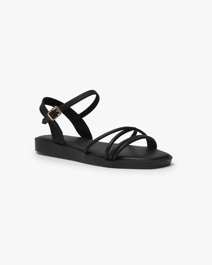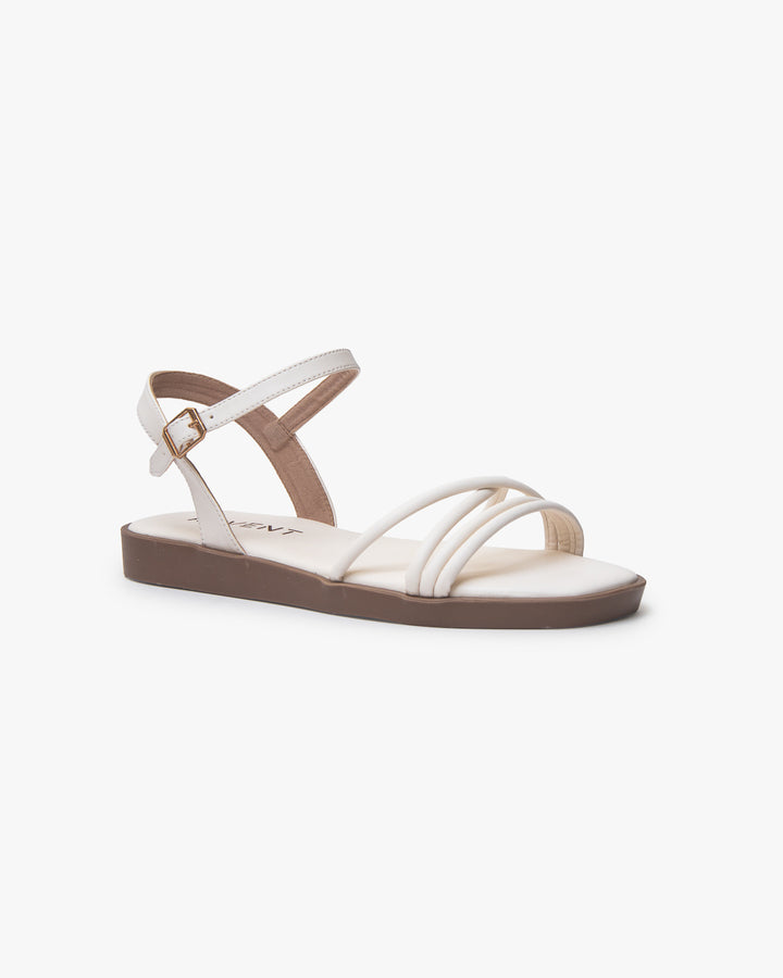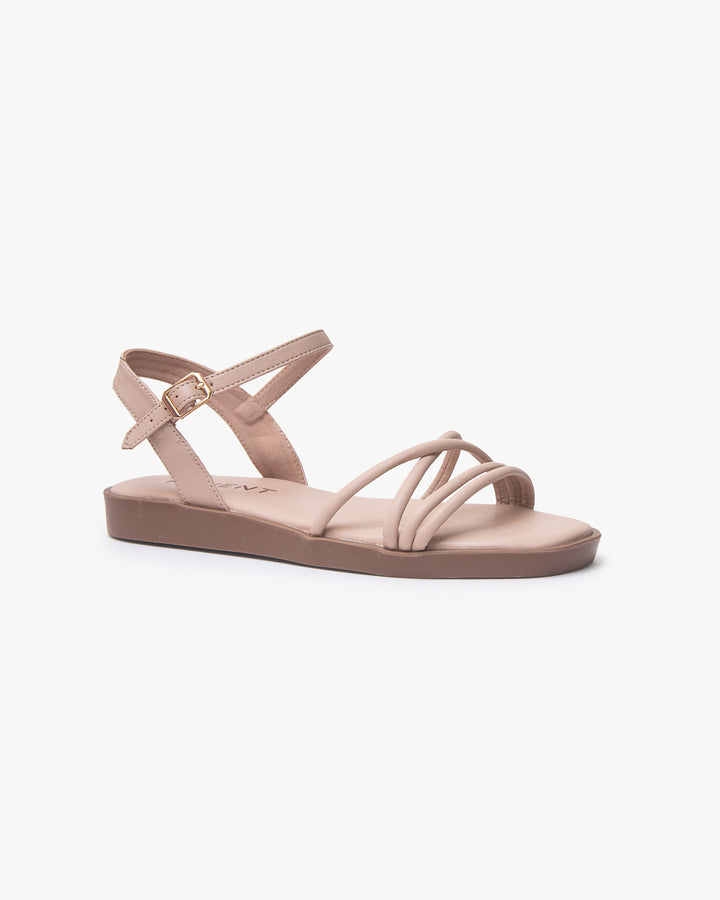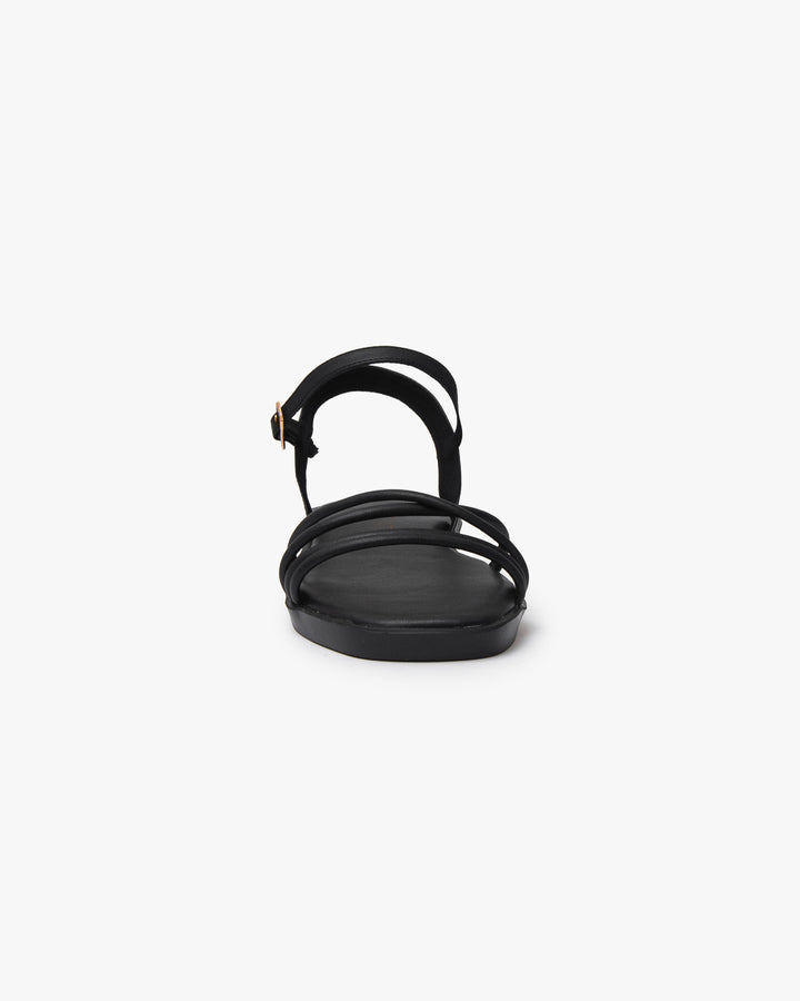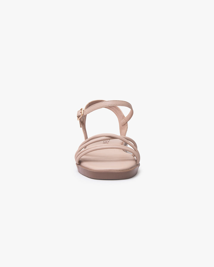 Sandalia plana de estilo minimalista y moderno. Su diseño incluye tres delgadas tiras tubulares al frente que sujetan los dedos, y una pulsera ajustable al tobillo con hebilla metálica dorada que aporta seguridad y estilo. Su suela acolchada para mayor comodidad que ofrece un uso práctico para el día a día.
