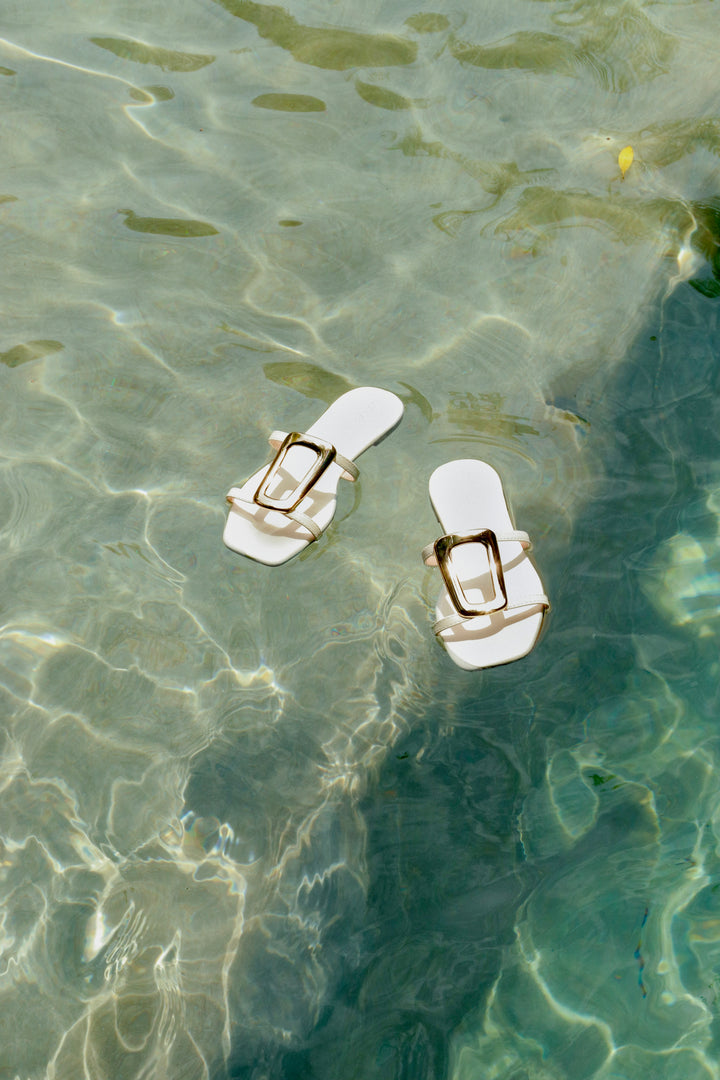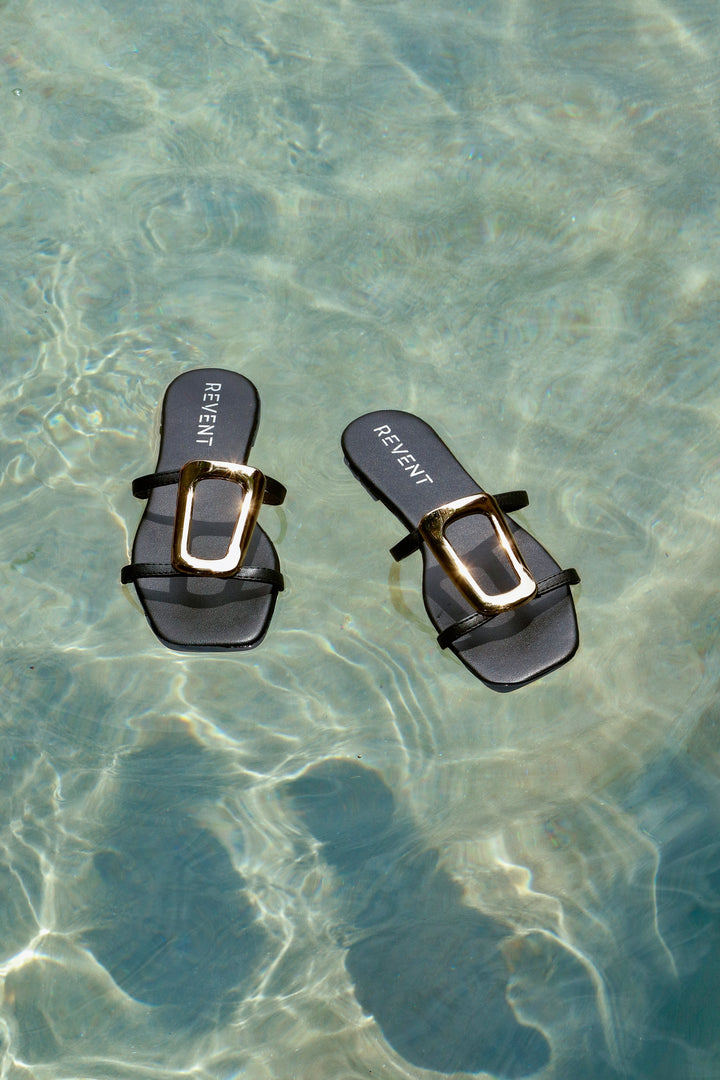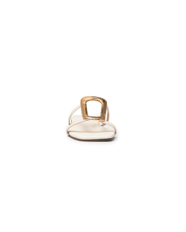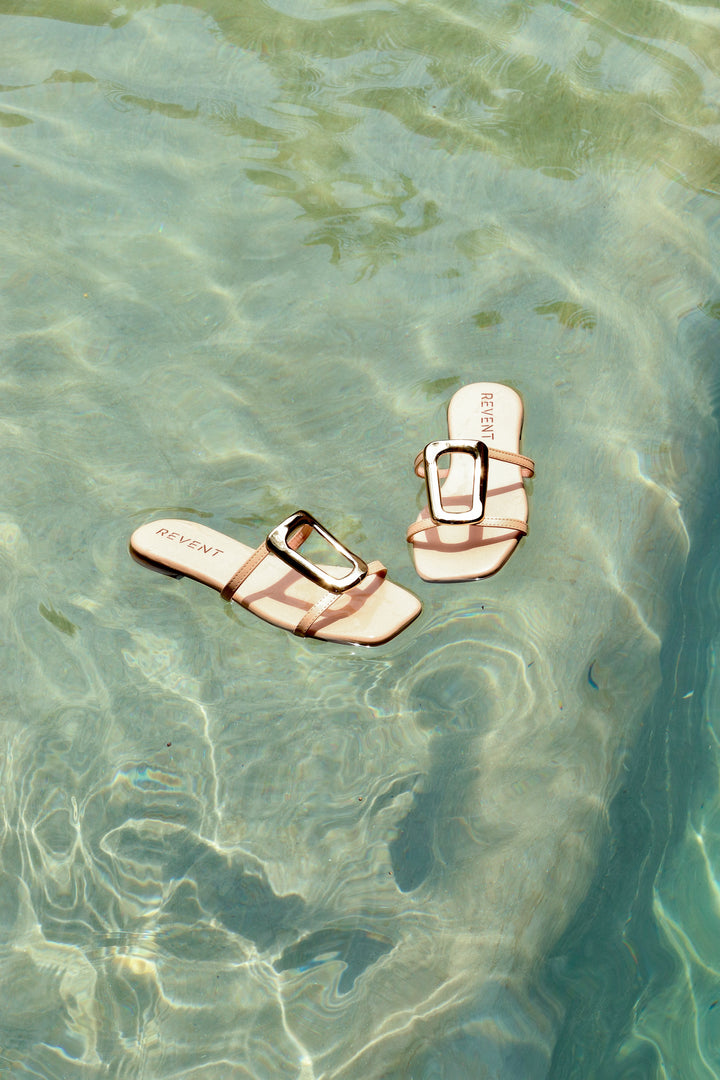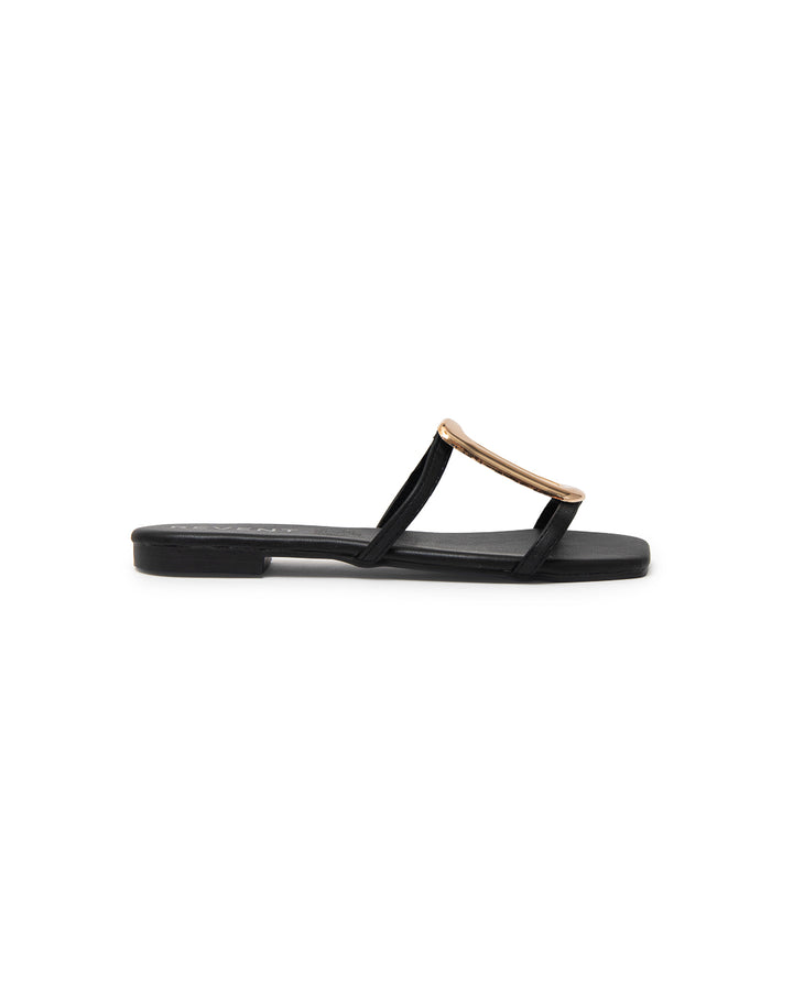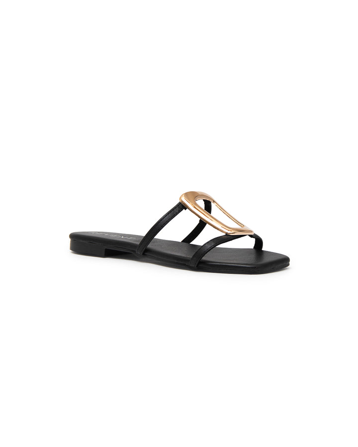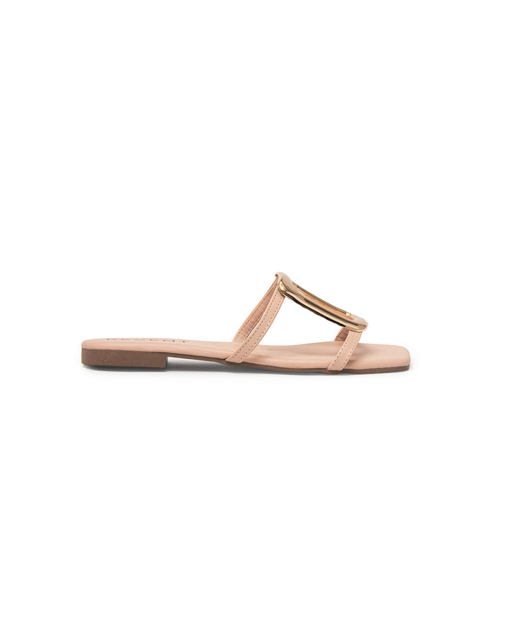 Sandalia plana para dama, con diseño moderno y elegante. Sus tiras delgadas forman un diseño minimalista en el empeine, realzado con un adorno metálico dorado en forma geométrica, que aporta un detalle sofisticado y llamativo.