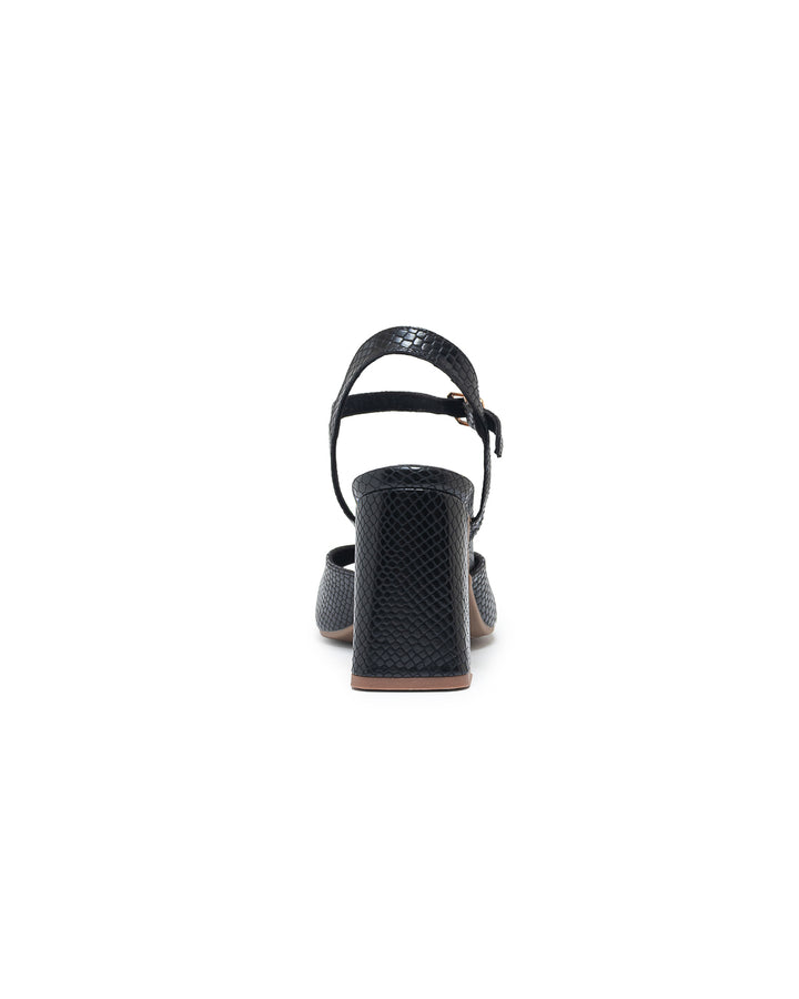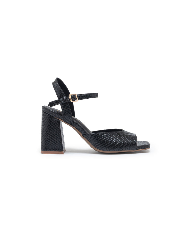 Sandalia de tacón ancho con acabado texturizado, diseñada con punta abierta y pulsera al tobillo ajustable mediante hebilla dorada que aporta un toque elegante; su tacón alto y cuadrado ofrece estabilidad y estilo, convirtiéndola en una opción sofisticada y versátil para looks formales, de oficina o salidas especiales.