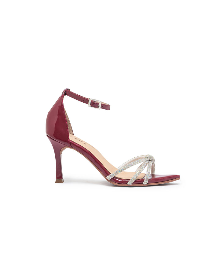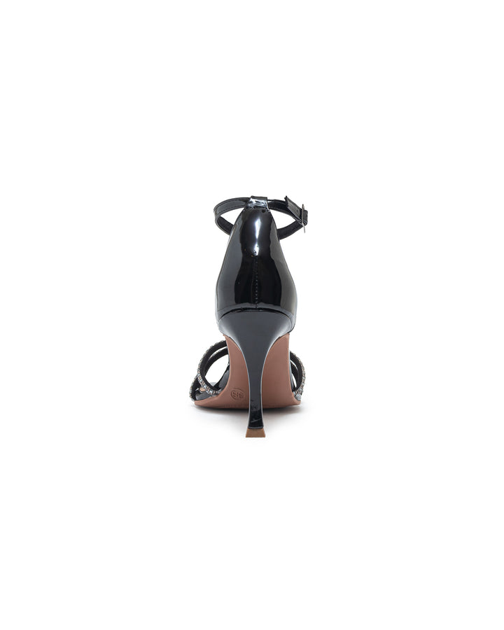 Tacón de dama en charol con diseño elegante de tiras delgadas adornadas con brillos, entrelazadas al frente para un toque sofisticado; cuenta con pulsera ajustable al tobillo con hebilla metálica y tacón curvado que estiliza la silueta, siendo ideal para eventos de noche, fiestas o looks formales con glamour.