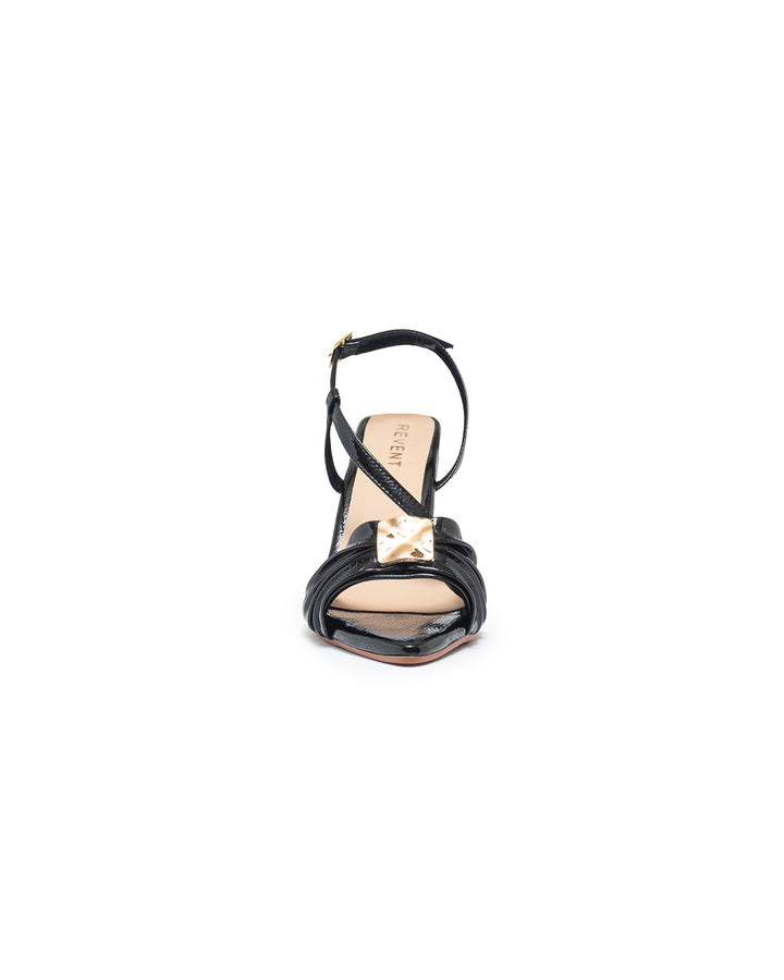 Tacón alto en charol con diseño elegante de punta abierta, tiras cruzadas al frente con pliegues y adorno metálico dorado que realza su estilo sofisticado; cuenta con correa ajustable al tobillo y tacón curvado que estiliza la silueta, ideal para eventos formales, ocasiones especiales o looks de noche con glamour.