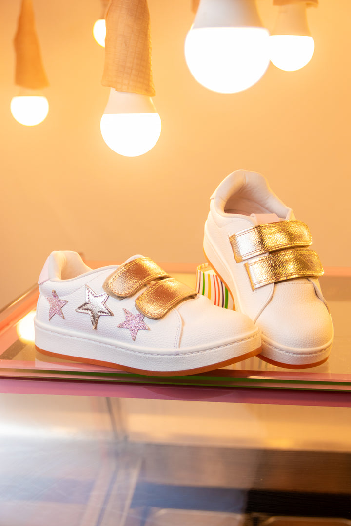 Tenis de niña lleno de brillo y diversión. Cuenta con detalles de estrellas, que le dan un toque mágico y encantador, incluye doble cierre de velcro en acabado metálico para un ajuste práctico y seguro. Su interior es suave y acolchado, y la suela de goma antideslizante brinda estabilidad en cada paso.