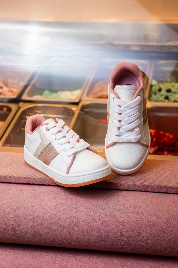 Tenis de niña fabricado en material sintético tipo cuero color blanco, incorpora franjas decorativas que le dan un toque brillante y femenino. Su diseño con cordones garantiza un ajuste firme perfecta para uso diario, colegio o actividades al aire libre.